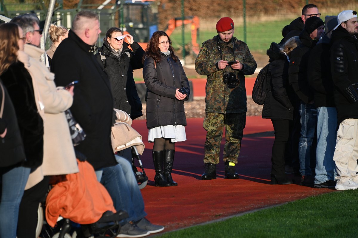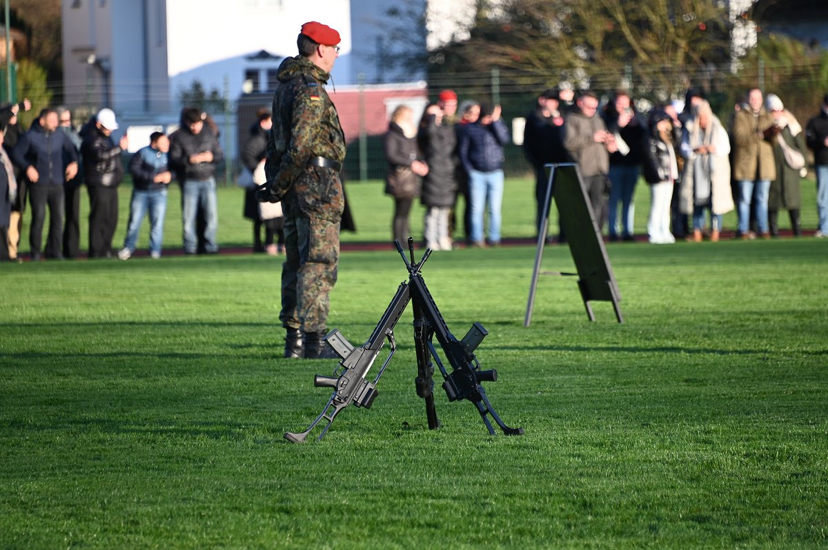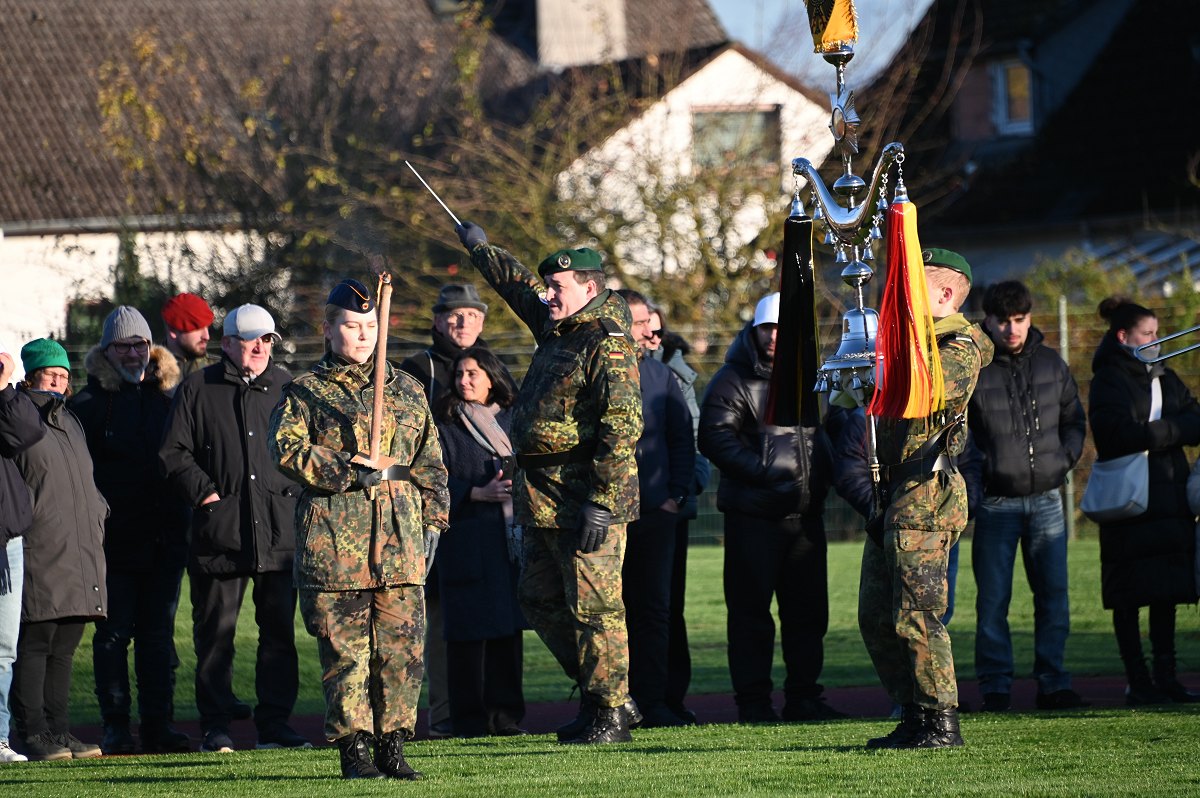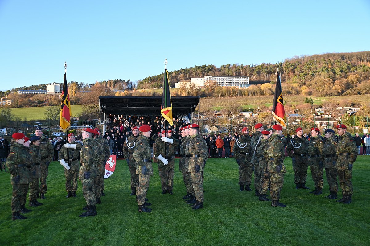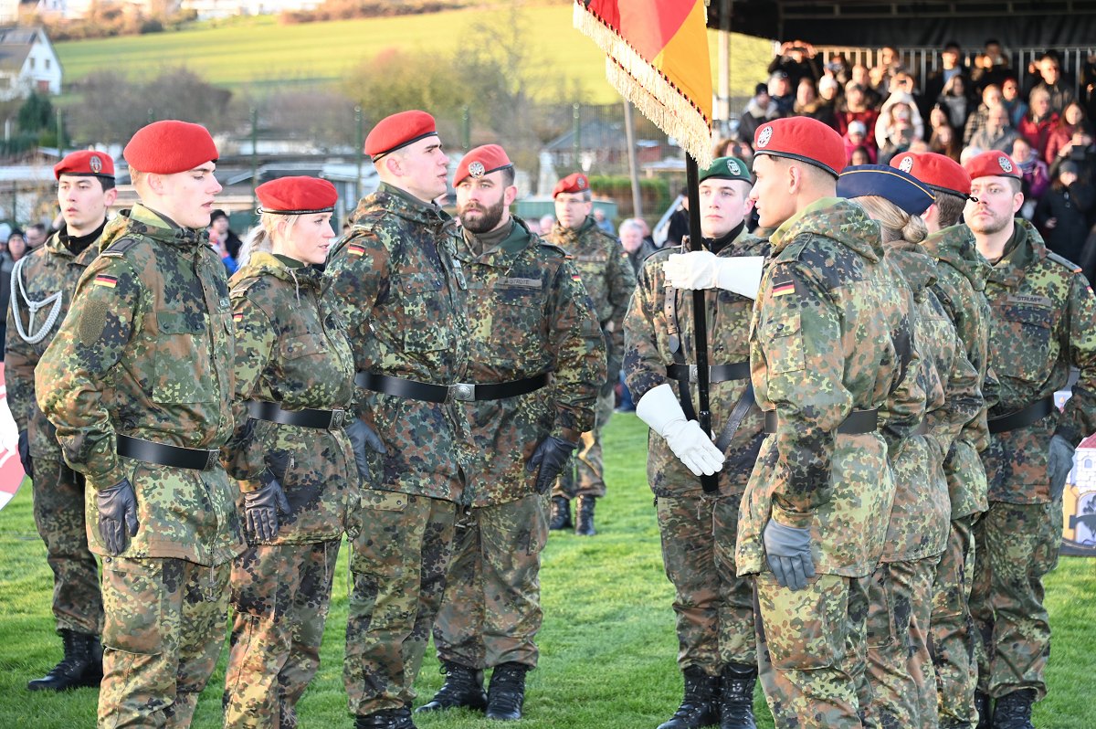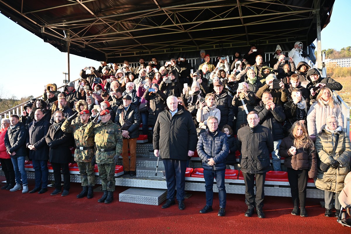 Der zentrale Moment des Appells folgte, als die Fahnenabordnungen und die Rekrutenabordnungen antraten, die Truppenfahnen gesenkt wurden und Oberst Lutz die Eidesformel sprach. Während das Heeresmusikkorps Kassel traditionelle Stücke wie den Preußischen Präsentiermarsch und das Altniederländische Dankgebet intonierte, legten die Rekruten ihr Gelöbnis ab: der Bundesrepublik Deutschland treu zu dienen und das Recht und die Freiheit des deutschen Volkes tapfer zu verteidigen. Es war ein Augenblick spürbarer Ernsthaftigkeit, der sich auch auf die viele Angehörigen übertrug, die diesen Schritt ihrer Söhne, Töchter und Partnerinnen sichtlich bewegt verfolgten. Mit der Nationalhymne erreichte der Appell seinen feierlichen Höhepunkt. Nach der offiziellen Feststellung des Gelöbnisses durch den Kommandeur folgten Gratulationen, persönliche Worte und Erinnerungsfotos bzw. -videos. Mit dem Ausmarsch der Ehrenformation endete der offizielle Teil der Veranstaltung, doch für die Rekrutinnen und Rekruten beginnt nun der nächste Abschnitt ihrer militärischen Ausbildung.