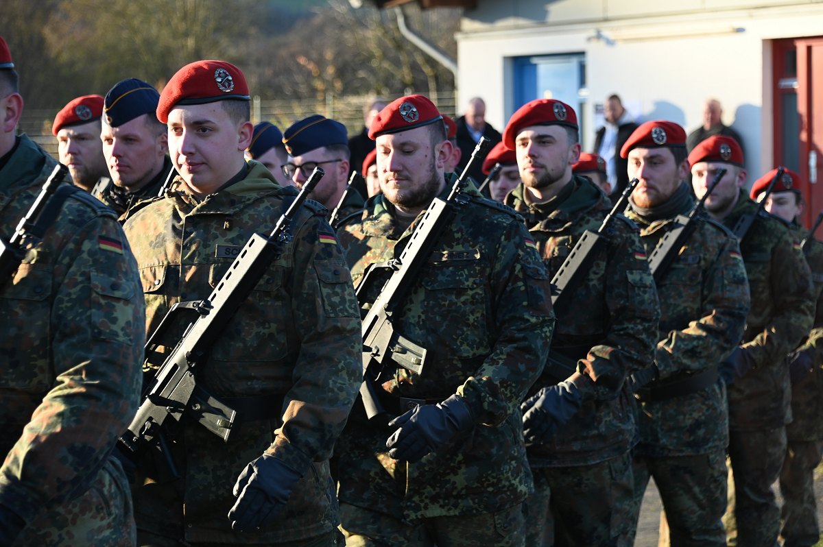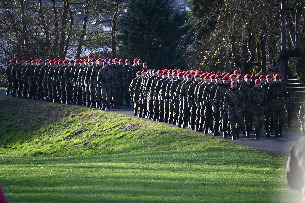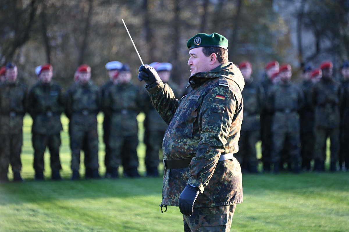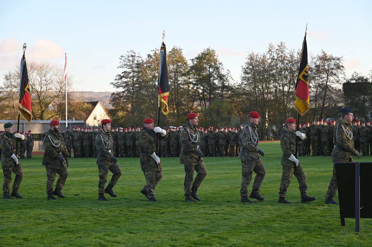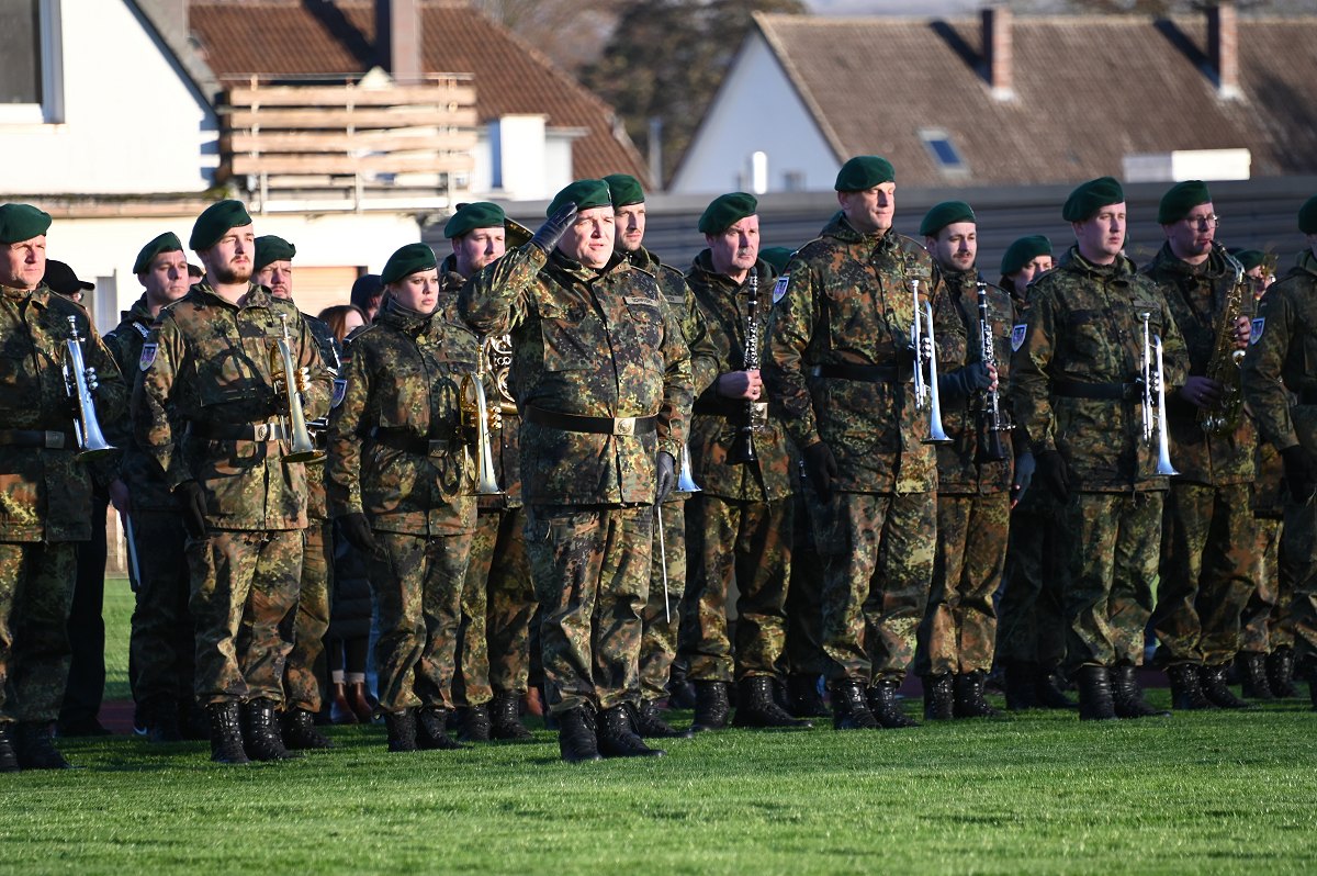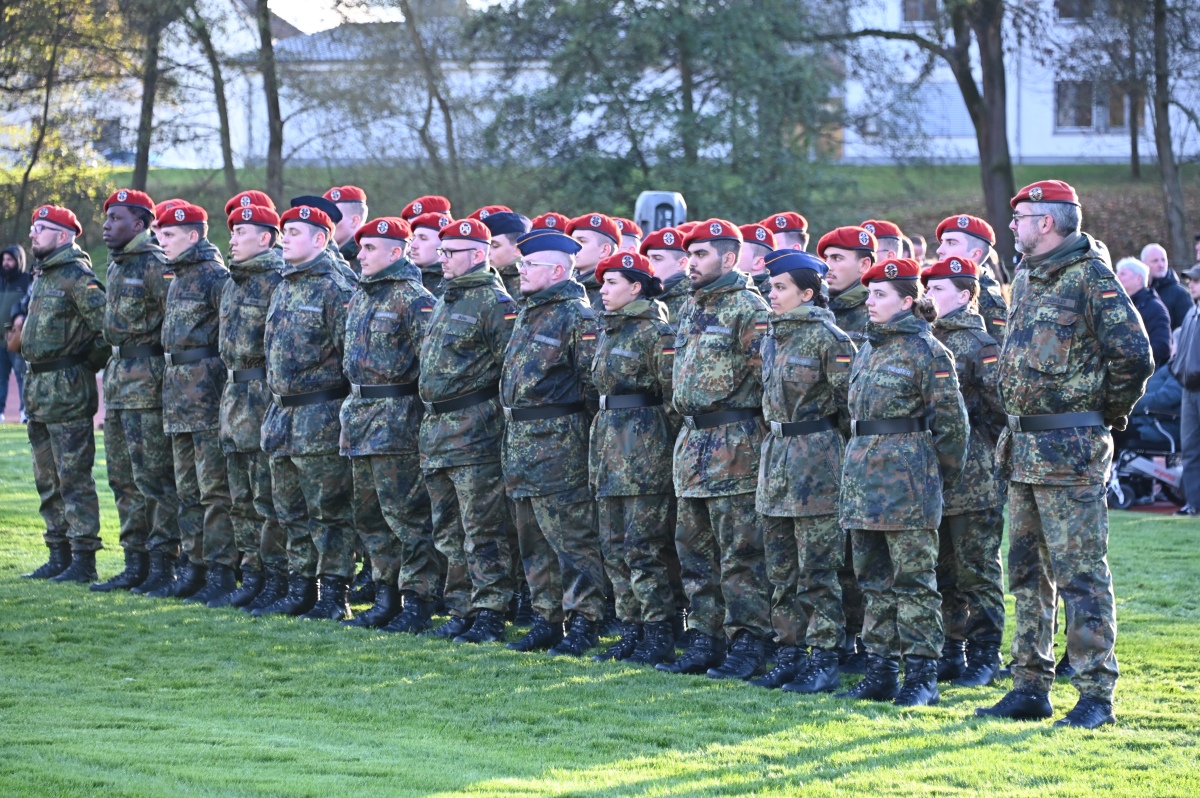 Der zentrale Moment des Appells folgte, als die Fahnenabordnungen und die Rekrutenabordnungen antraten, die Truppenfahnen gesenkt wurden und Oberst Lutz die Eidesformel sprach. Während das Heeresmusikkorps Kassel traditionelle Stücke wie den Preußischen Präsentiermarsch und das Altniederländische Dankgebet intonierte, legten die Rekruten ihr Gelöbnis ab: der Bundesrepublik Deutschland treu zu dienen und das Recht und die Freiheit des deutschen Volkes tapfer zu verteidigen. Es war ein Augenblick spürbarer Ernsthaftigkeit, der sich auch auf die viele Angehörigen übertrug, die diesen Schritt ihrer Söhne, Töchter und Partnerinnen sichtlich bewegt verfolgten. Mit der Nationalhymne erreichte der Appell seinen feierlichen Höhepunkt. Nach der offiziellen Feststellung des Gelöbnisses durch den Kommandeur folgten Gratulationen, persönliche Worte und Erinnerungsfotos bzw. -videos. Mit dem Ausmarsch der Ehrenformation endete der offizielle Teil der Veranstaltung, doch für die Rekrutinnen und Rekruten beginnt nun der nächste Abschnitt ihrer militärischen Ausbildung.