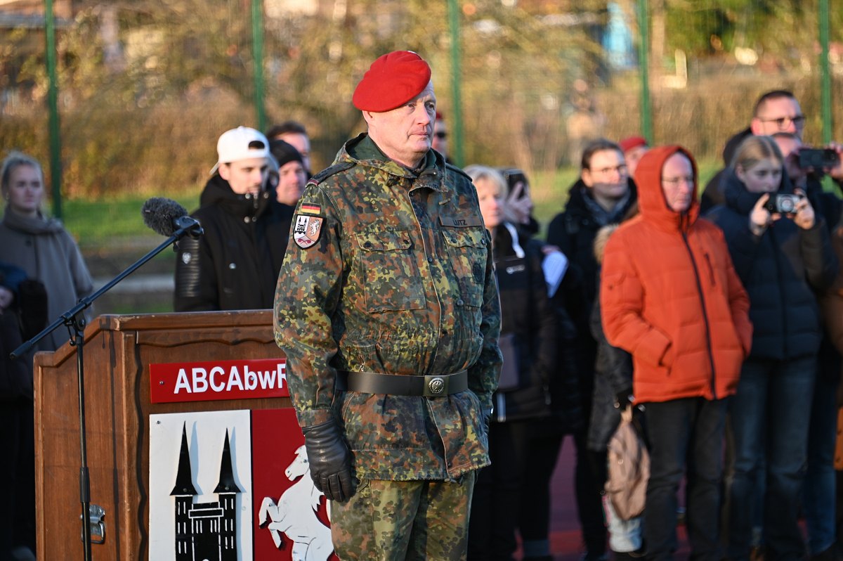 Besondere Aufmerksamkeit galt den 18 Rekrutinnen und Rekruten, die stellvertretend für alle Angetretenen vor die Truppenfahnen traten. Im Anschluss ergriff Dr. h.c. Frank-Jürgen Weise, Oberst der Reserve, das Wort. In seiner eindrucksvollen Rede machte er deutlich, dass Freiheit und Recht zu verteidigen längst keine Floskel mehr seien. Er sprach offen über sicherheitspolitische Herausforderungen, die Europa heute beschäftigen, und warnte vor den zunehmenden hybriden Bedrohungen, die längst im Alltag angekommen seien. Zugleich betonte er, dass Deutschland trotz aller Spannungen nicht in unmittelbarer Kriegsgefahr stehe, auch, weil die Stärke der NATO eindeutig sei. Vor allem aber richtete er seinen Blick auf die Rekrutinnen und Rekruten: Ihr Dienst sei wertvoll, ihre Ausbildung bedeutend, und die Erfahrungen, die sie sammeln, könnten sie ein Leben lang prägen.