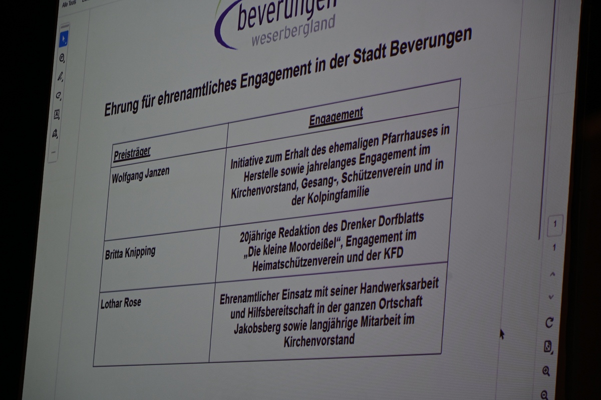Den zweiten Ehrenamtspreis als „Stimme von Drenke“ erhielt Britta Knipping, deren Wirken das Dorf Drenke seit Jahrzehnten präge. Bürgermeister Wenkel würdigte ihr langjähriges Engagement in Kirche, der kfd und im Gemeindeleben, vor allem jedoch ihre mehr als 20-jährige Arbeit für das Drenker Dorfblatt „Kleine Moordeißel“. Rund 250 Ausgaben lang hielt sie das Dorf informiert, verband Tradition und Digitalisierung und spielte gerade während der Corona-Pandemie eine entscheidende Rolle für den Zusammenhalt. Darüber hinaus war Knipping im Heimatschützenverein aktiv, organisierte Jugendfahrten und erwarb die Schießleiter-Qualifikation. Sie sei eine Frau, „deren Einsatz Heimat spürbar macht“. ## Der dritte Ehrenamtspreis ging an Wolfgang Janzen aus Herstelle, dessen jahrzehntelanges Engagement kaum zu übertreffen sei, wie Wenkel betonte. 46 Jahre lang war Janzen Mitglied im Kirchenvorstand, sowohl für seinen Kirchort als auch für die gesamte Pfarrei. Unter seiner Mitwirkung wurden zahlreiche kirchliche Gebäude weiterentwickelt, darunter das Pfarrheim und das ehemalige Pfarrhaus, das dank seines Einsatzes restauriert und unter Denkmalschutz gestellt werden konnte. Doch sein Wirken habe weit darüber hinaus gewirkt: Janzen engagierte sich in der Kolpingfamilie, im Schützenverein, im Gesangverein und war fast drei Jahrzehnte Vertreter im Bezirksausschuss. Wenkel würdigte ihn als „Mann, der hinsieht, Verantwortung übernimmt und seiner Gemeinschaft Stabilität verleiht“.