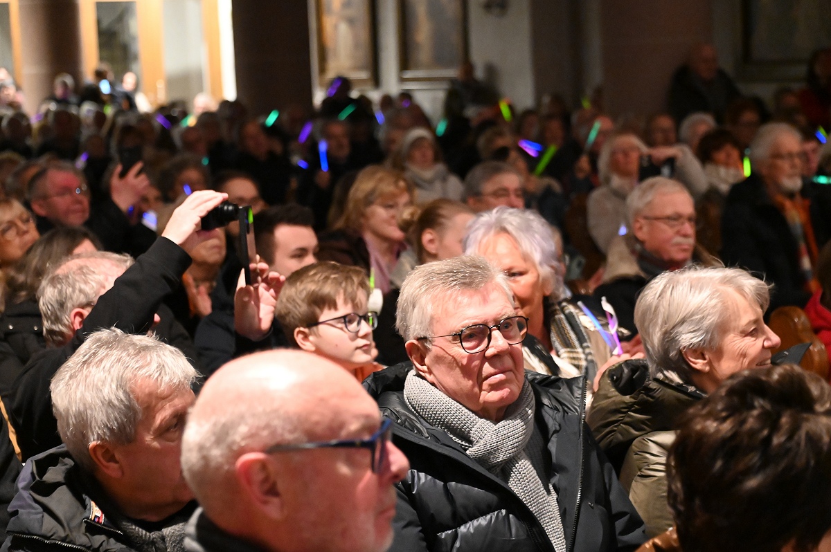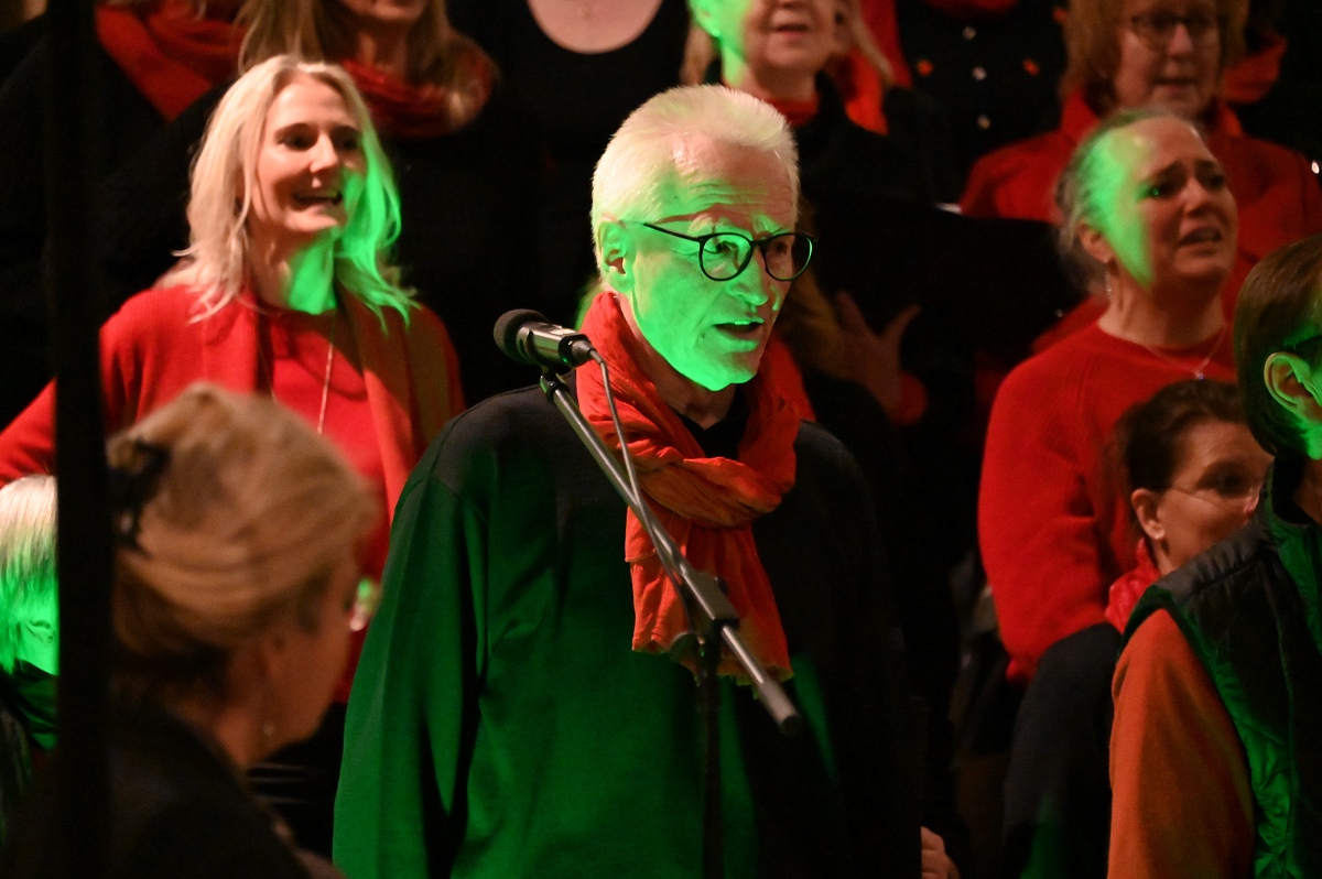 Ein besonderer Höhepunkt des Abends war der tänzerische Auftritt von Anke Schregel, die zum Lied „Lord Of The Dance“ mit ausdrucksstarker Bewegung die Kirche förmlich zum Leben erweckte. Während sie durch die Reihen schritt, wurde sie von den kraftvollen Stimmen des Chors begleitet und sorgte für einen magischen Moment. Für einen weiteren Gänsehautmoment sorgte der 20-jährige Timo Ising. Mit seiner gefühlvollen Interpretation von „Du bist so“ berührte der junge Mann mit Handycap die Herzen der Anwesenden. Seine ausdrucksstarke Stimme und lebhaften Gesten machten diesen Auftritt zu einem emotionalen Höhepunkt des Konzerts und setzten zugleich ein starkes Zeichen für gelebte Inklusion. Musikalisch überzeugten die LIVING VOICES mit einem abwechslungsreichen Repertoire. Neu arrangierte Weihnachtsklassiker wie „Winter Wonderland“, „Santa Claus Is Coming to Town“, „Shepherds Run“ und „Feliz Navidad“ sorgten für vertraute Melodien in frischem Gewand. Passend zum 15-Jährigen erklangen insgesamt auch 15 Titel. Für besondere Klangfarben sorgte erneut die dreiköpfige Band mit dem britischen Keyboarder Peter Moss, Bassist Peter Kros und Percussionist Yukinobu Ishikawa. Die Soloparts wurden von den vereinseigenen Sängerinnen und Sängern Monique Sandmann, Nicole Timmermann, Johanna Potthast, Werner Humann, Heiner Wiemers-Meyer sowie Matthias Kämpfer und Walter Cappell übernommen. Zusätzliche Instrumentalbeiträge, unter anderem von Helena Holletzek an der Blockflöte, rundeten das Klangbild ab. Zum Abschluss des Konzerts erhob sich das Publikum zu stehenden Ovationen und daher gab es auch noch eine Zugabe.