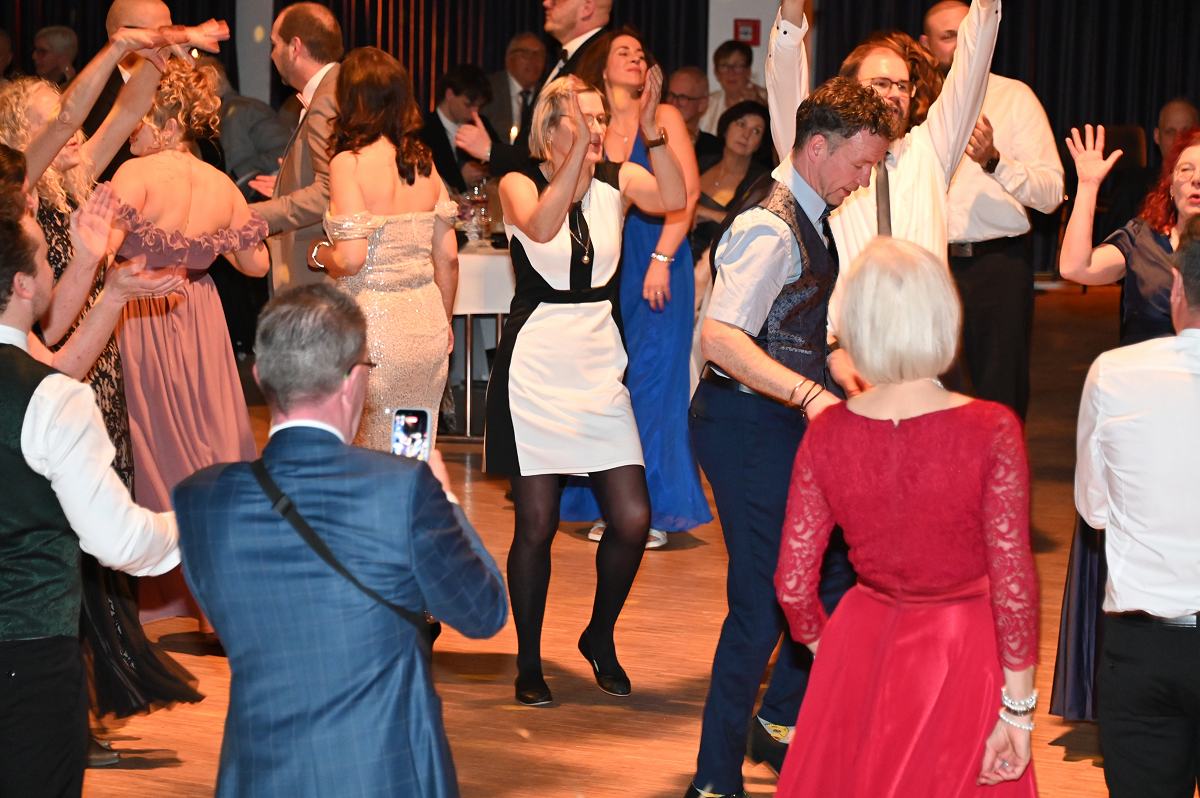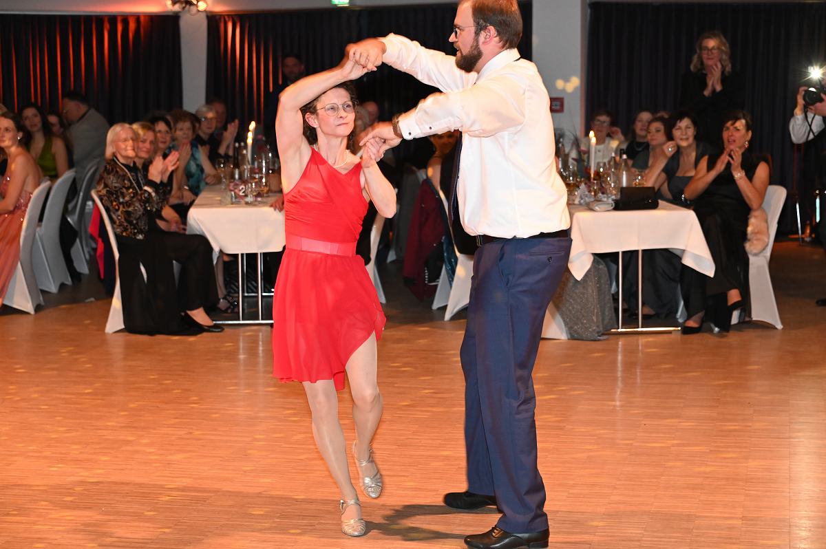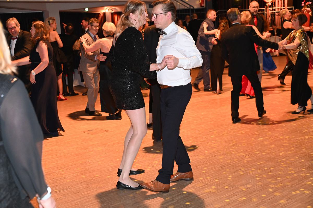 Doch statt Enttäuschung folgte Begeisterung: Ball-Besucher Daniel Hesse von der Tanzschule Hesse aus Heiligenstadt sprang spontan ein und „rettete“ den zweiten Hauptact. Mit einer Line-Dance-Vorführung, Animationen und einem eigenen Tanzpaar brachte Hesse die Stimmung zum Kochen. „Wir haben uns das aus den Fingern gesogen“, sagte er schmunzelnd und traf damit genau den Geschmack des Publikums. Besonders der Auftritt des Tanzpaares Diana und Michael aus Heiligenstadt zum Song „Pretty Woman“ sorgte für großen Applaus. Insgesamt war die Gruppe mit 26 Personen vertreten. Für Daniel Hesse schloss sich dabei ein Kreis: Bereits vor 15 Jahren hatte er in der Stadthalle Beverungen Tanzkurse gegeben. Seine Verbundenheit zum Kulturball sei bis heute geblieben. Für die musikalische Begleitung sorgten Jürgen Becker und seine Amorados Showband. Die achtköpfige Formation überzeugte erneut mit ihrer großen musikalischen Bandbreite und direkter Publikumsnähe. Die Tanzfläche blieb daher durchgehend gut gefüllt, wenn sie vom Walzer bis Disco-Fox mit einer großen Bandbreite an bester Ball-Musik begeisterten.