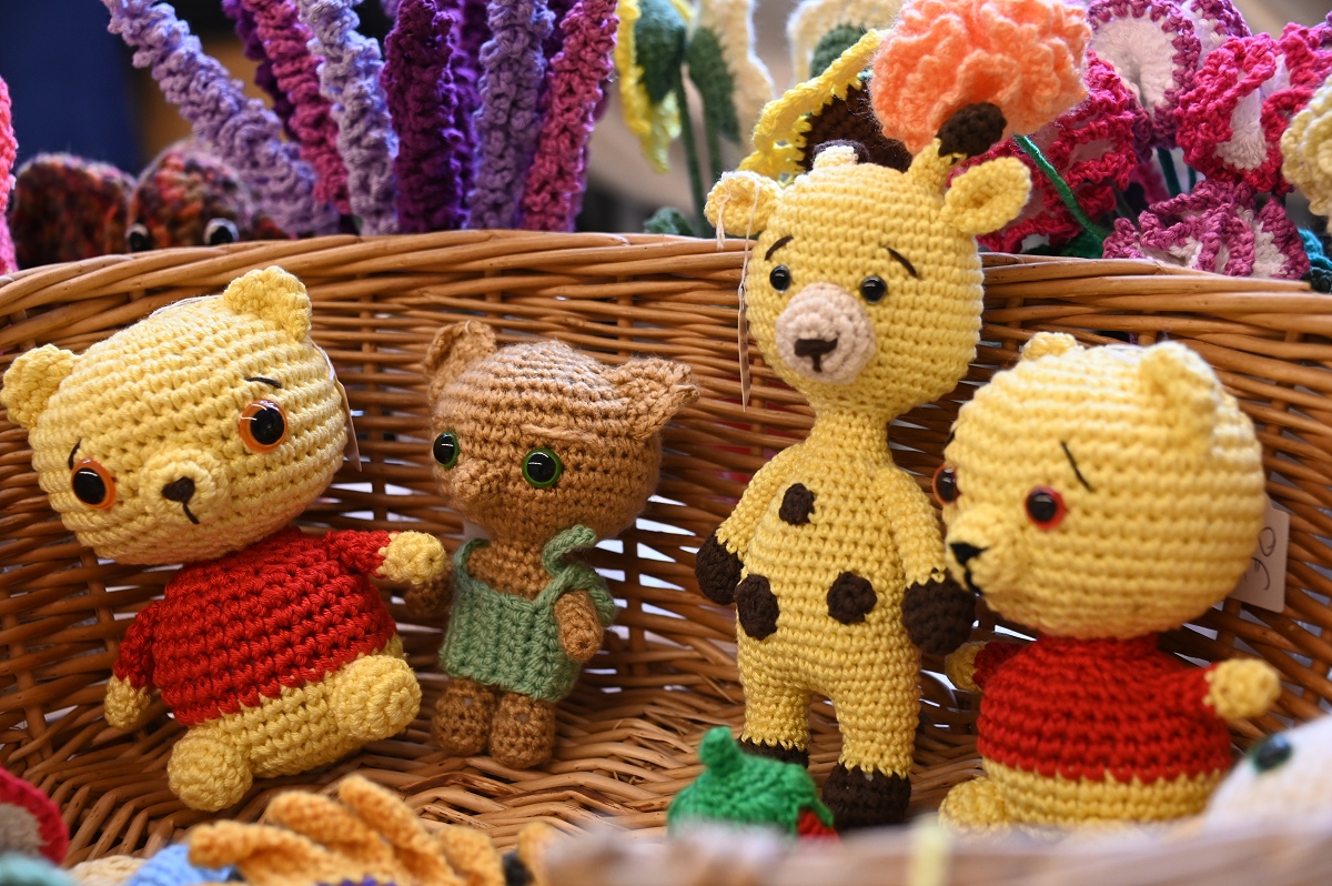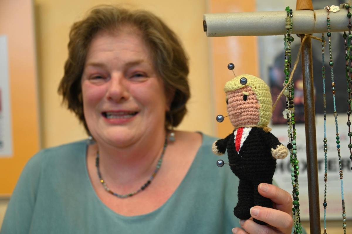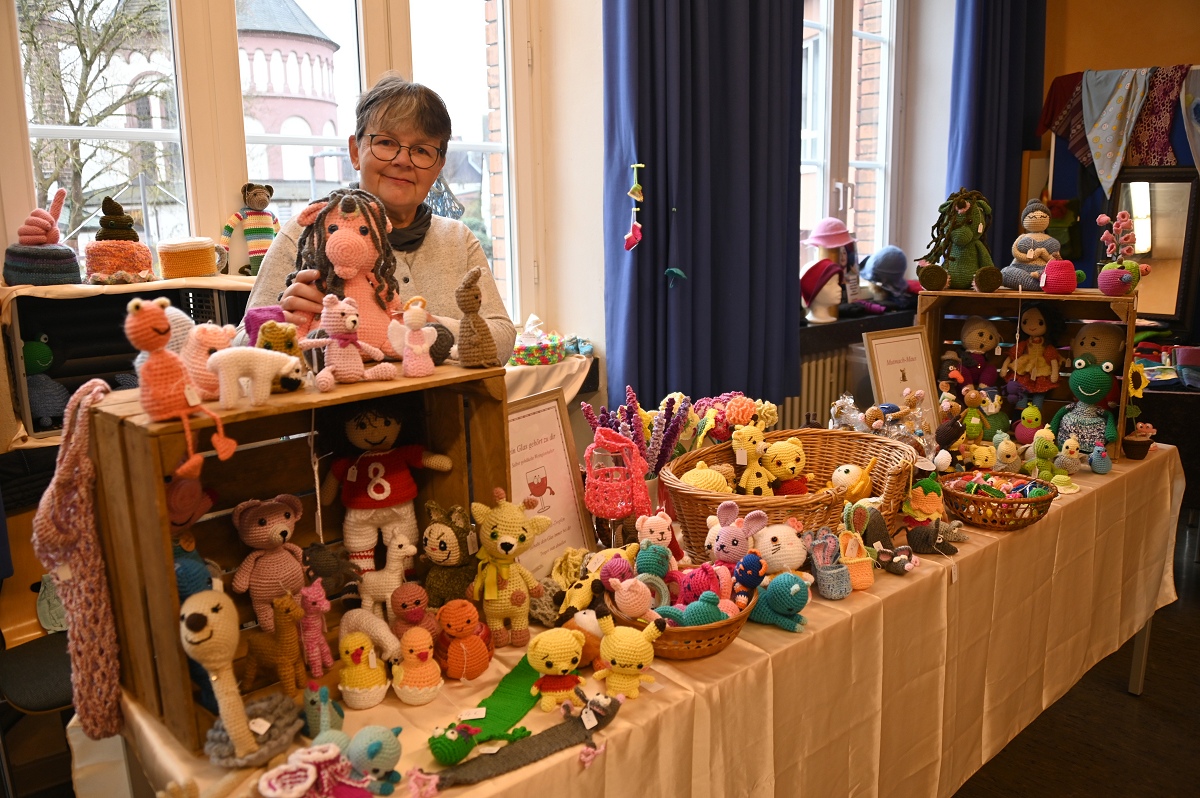 Auch textile Arbeiten waren stark vertreten. Angeboten wurden unter anderem Taschen aus Jeansstoff, Beutel, Rucksäcke und Leseknochen. Hinzu kamen genähte, gestrickte und gehäkelte Stücke für Kinder und Erwachsene, darunter Baby- und Puppenkleidung, Jacken und Pullover. An mehreren Ständen wurde außerdem Schmuck verkauft, ergänzt durch Schmuckkarten und feine Handarbeiten. Blickfänger waren ebenso Bilder in Aquarell-, Acryl-, Seiden- und Steintechnik, die von vielen Besuchern aufmerksam betrachtet wurden. Wie viel Arbeit hinter den Stücken steckt, zeigte sich im Gespräch mit den Ausstellerinnen. Ingrid Ferk aus Höxter strickt Pullover in verschiedenen Farben und Formen. Bis zu vier Tage arbeitet sie an einem einzelnen Stück. Schon das Material schlägt mit rund 50 Euro zu Buche. Reich wird man damit nicht, machte sie deutlich. Für sie steht ohnehin etwas anderes im Vordergrund: Sie strickt, weil es ihr Freude macht. Mit fantasievollen Häkelarbeiten war Elke Besse aus Boffzen vertreten. Seit rund zehn Jahren fertigt sie Tiere, Menschen und Fabelwesen mit ganz eigenem Ausdruck. Je nach Größe sitzt sie bis zu zwei Tage an einer Figur. Für Aufsehen sorgte eine ihrer Arbeiten besonders: Im Auftrag entstand eine Trump-Figur, die Silvia Beth aus Höxter später zur Voodoo-Puppe machte. Beth war selbst mit einem Stand auf dem Markt vertreten und zeigte damit, dass kreative Ideen hier auch mal augenzwinkernd und politisch unkorrekt daherkommen dürfen.