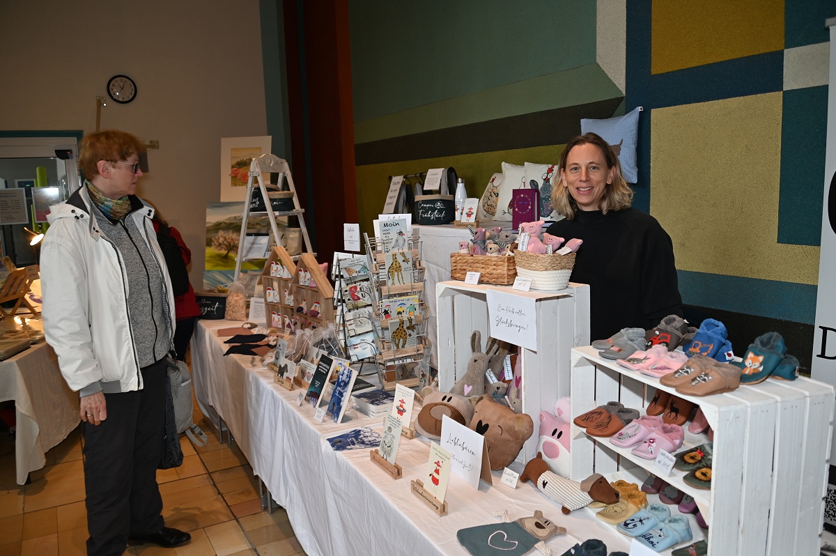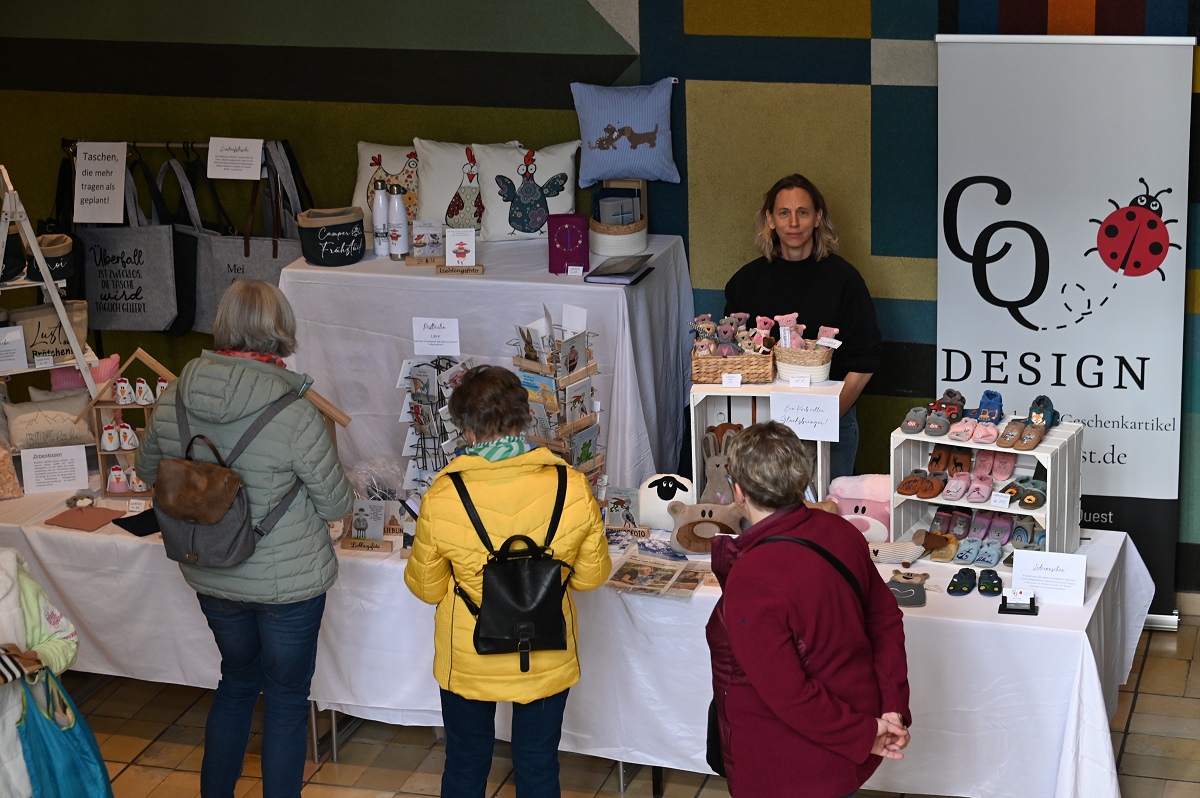 Zu den vertrauten Gesichtern des Marktes gehört Ortrud Wilde aus Boffzen. Sie nimmt seit mehr als 20 Jahren teil und arbeitet seit über drei Jahrzehnten kreativ mit Perlen. Den Zugang zu diesem Handwerk fand sie einst auf einer Messe in Hannover. Heute fertigt sie filigrane Ketten aus winzigen Perlen. „Echte Fummelarbeit und nur Einzelstücke“, sagte sie über ihre Arbeiten, die viel Präzision verlangen. Eine ungewöhnliche Premiere gab es mit Christina Bosser aus Scherfede. Sie war zum ersten Mal dabei und nutzte einen kleinen Stand, um auf ihr neu gegründetes Kleinunternehmen aufmerksam zu machen. Ihr Thema: Katzenpsychologie. Dabei gehe es um die Analyse von Verhaltensproblemen, die bei Tieren durch unterschiedliche Umstände entstehen können, erklärte sie. Zwischen Deko, Handarbeit und Geschenkideen setzte sie damit einen eher ungewöhnlichen, aber durchaus passenden Akzent.