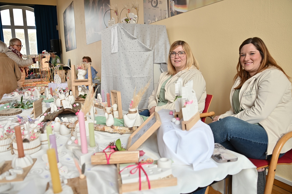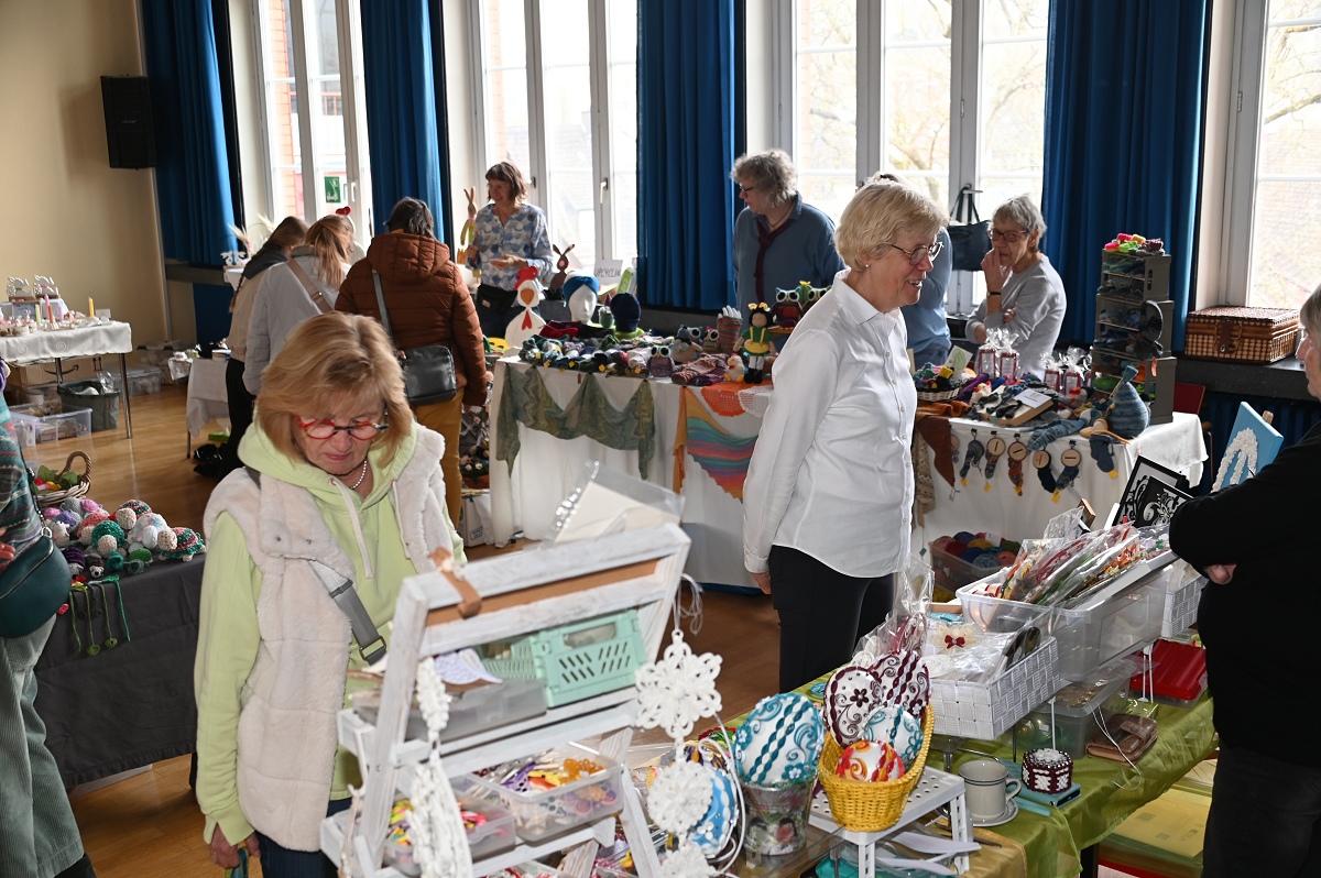 Höxter (TKu). Zwischen Osterkränzen, Schmuck und handgestrickten Pullovern wurde wieder viel Kreatives angeboten beim diesjährigen Höxteraner Kreativmarkt in der Volkshochschule am vergangenen Sonntag. Genau dieser Kontrast machte den Reiz der Veranstaltung aus: klassisches Kunsthandwerk, originelle Ideen und viele persönliche Geschichten trafen am Sonntag auf fünf Ebenen der VHS aufeinander. Im Rahmen der Frauenaktionswochen hatte das Team „HÖXTI AKTIV“ erneut in die Räume an der Möllinger Straße eingeladen. 43 Ausstellerinnen und Aussteller präsentierten dort ihre Arbeiten. Viel Platz blieb nicht mehr. „Mehr Anbieter finden hier auch keinen Platz“, sagte Organisatorin Marianne Heinemeyer. Tatsächlich war das Gebäude vom Souterrain bis hinauf zum Dachboden komplett belegt. Gemeinsam mit ihrem Team stellte sie den Markt in gewohnter Größe wieder auf die Beine und zeigte sich dankbar für die Unterstützung, die die Durchführung erneut möglich machte. Wer durch die Flure und Räume schlenderte, bekam schnell einen Eindruck davon, wie breit das Angebot gefächert war. Im Mittelpunkt standen viele handgemachte Einzelstücke, die mit Geduld, Erfahrung und viel Liebe zum Detail entstanden waren. Passend zur Jahreszeit dominierten Frühlings- und Osterartikel viele Tische: Kränze, Gestecke und aufwendig gestaltete Ostereier in ganz unterschiedlichen Formen und Materialien sorgten für farbige Akzente. Daneben fanden sich Seifen, Kerzen und Dekorationen für Haus und Garten.