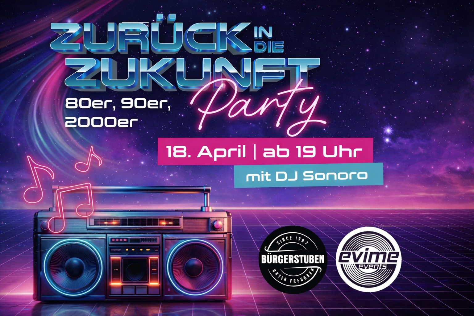 Höxter (zir). Mit der Party „Zurück in die Zukunft – Die 80er, 90er & 2000er Party!“ steht am 18. April 2026 in den Bürgerstuben Höxter eine musikalische Zeitreise durch drei Jahrzehnte bevor. Ab 19 Uhr soll die Veranstaltung in der Adresse „Am Markt“ in Höxter beginnen.