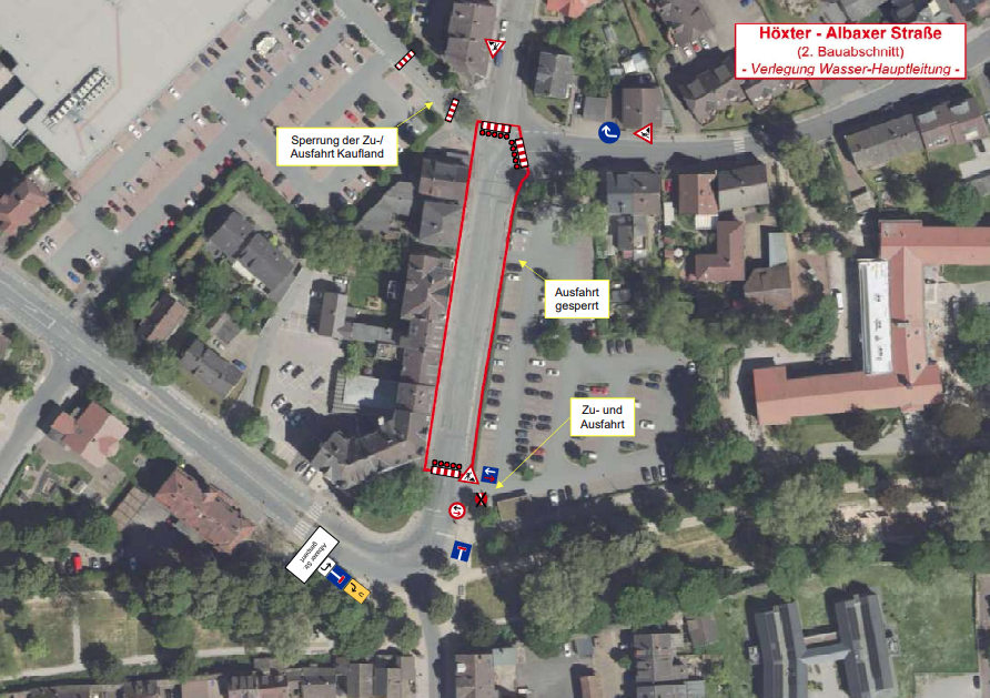 Höxter (red). Im Zuge der Erneuerung einer Trinkwasserhauptleitung in der Albaxer Straße im Bereich des Berliner Platzes erfolgt ab dem heutigen Tag der Wechsel vom 1. in den 2. Bauabschnitt. Die Vollsperrung der Albaxer Straße bleibt in diesem Bereich voraussichtlich bis Mitte Mai bestehen.