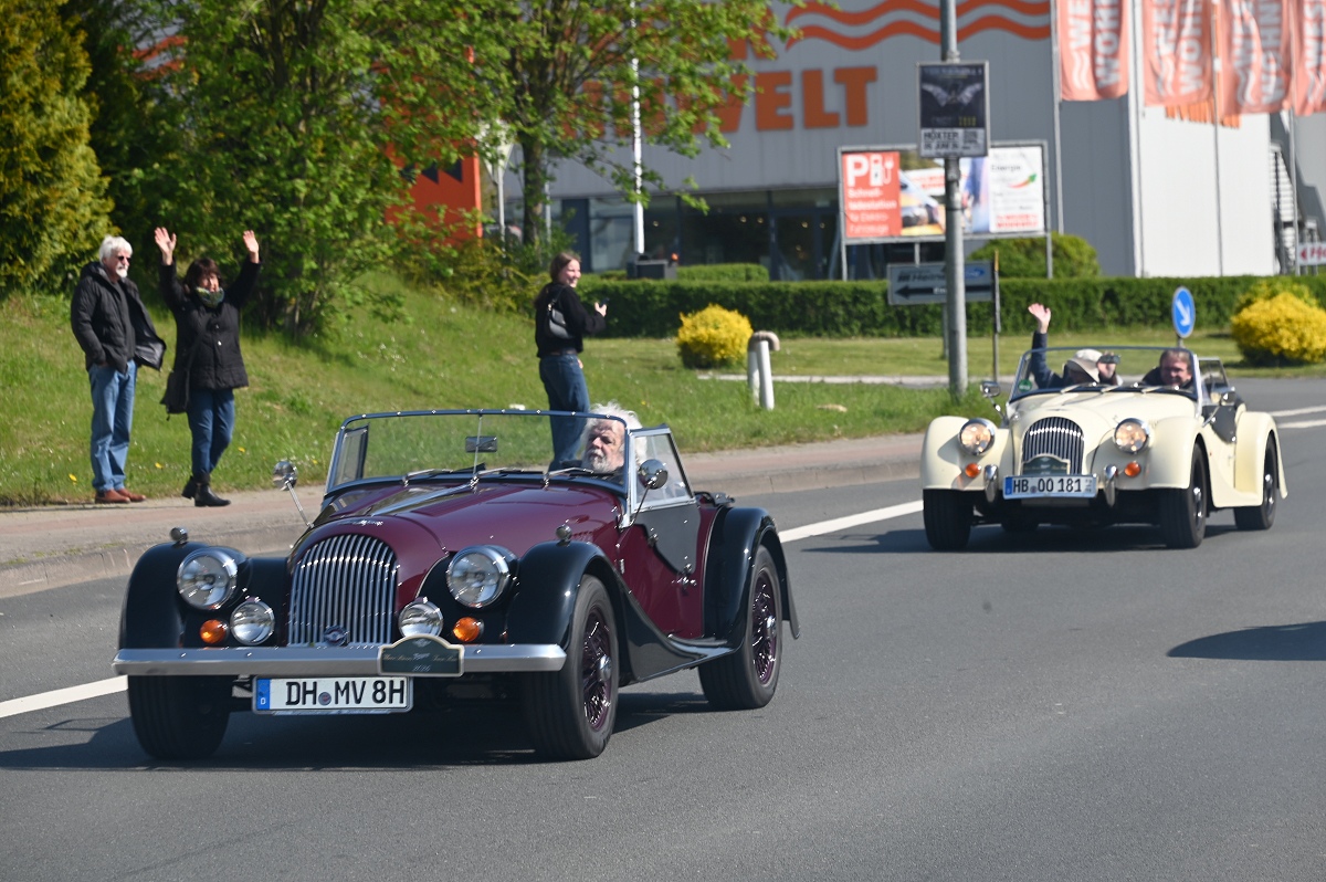 Höxter (TKu). Eine ungewöhnliche Fahrzeugkolonne hat sich am Samstagvormittag bei strahlendem Sonnenschein von Höxter aus durch das Weserbergland in Bewegung gesetzt: 14 handgefertigte Sportwagen der britischen Marke Morgan starteten vom Parkplatz eines Burger-Restaurants zu einer zweitägigen Tour durch die Region.