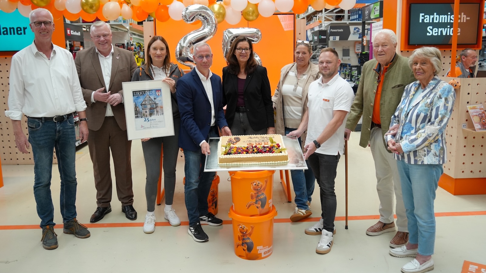 Bürgermeister Daniel Hartmann gratulierte dem Baumarkt-Team zum Jubiläum, überreichte eine Urkunde und gestand: „Ich bin ein Baumarkt-Typ.“ Auch er wandelt regelmäßig durch die Gänge des OBI und ist langjähriger Kunde.